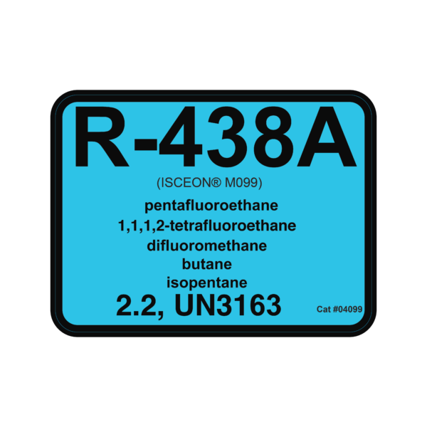 These 3in. x 4in. self-adhesive vinyl labels use a high-tack acrylic adhesive and UV cured screen printing. Color coded to conform to refrigerant labeling convention. Each label indicates the type of refrigerant (eg. R-11), the chemical name (eg. Trichloromonofluromethane) and the UN No. (eg. UN 1078). Avoid costly mistakes by properly identifying the type of refrigerant contained in recovery cylinders and air conditioning and refrigeration equipment.