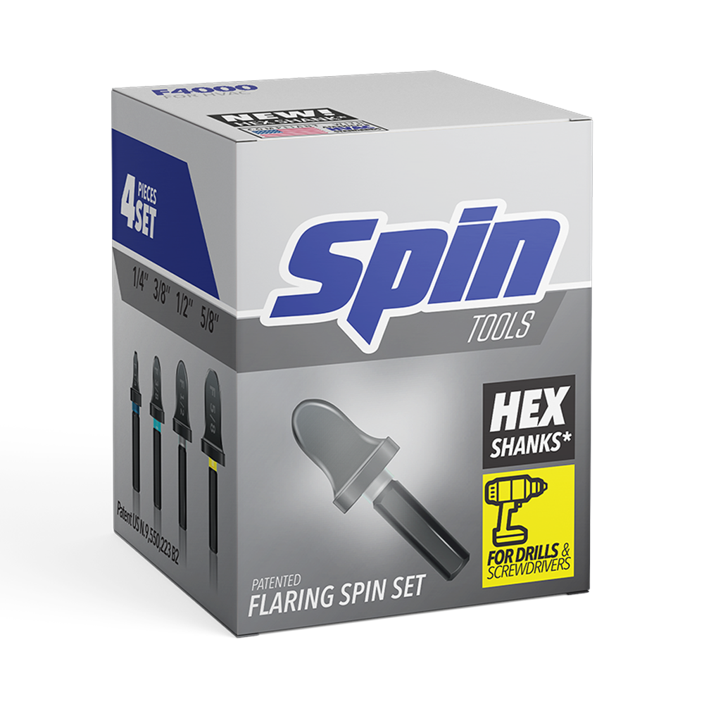 SPIN Flaring Tool Set containing 4 pieces in a set, with the following diameters: 1/4″, 3/8″, 1/2″ and 5/8″ (tube’s outer diameter). Capable of Flaring Soft Copper and Aluminum when coupled to a drill. Uses a system of heat by friction.