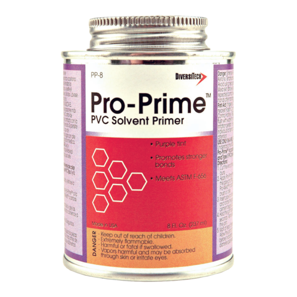 A purple-tinted primer formulated to remove dirt and oil from the surface of Type I and II PVC piping, as well as soften the piping in preparation for solvent welding. Pro-Prime™ contains purple pigment which provides verification that the primer has been applied to the pipe surface. Pro-Prime™ meets ASTM Standard F-656.
